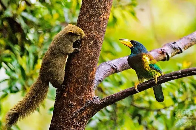 大擬啄木鳥(niǎo)和赤腹松鼠奪食。類似場(chǎng)景在高黎貢山每天都會(huì)上演。