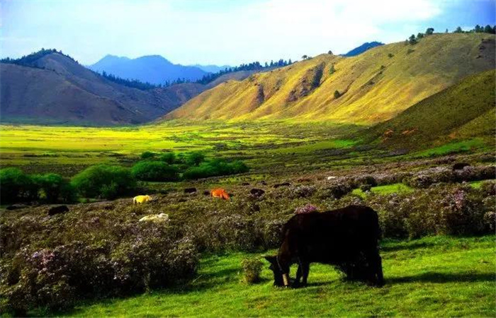大羊場是一片高原牧場風(fēng)光,主要由高山草甸組成,在草甸上向東可看見玉龍雪山、哈巴雪山的皚皚白雪;向西可盡覽碧羅雪山那綿延千里的磅礴氣勢;向北可遙望白茫雪山、梅里雪山的英姿;南面穿過原始森林則可到羅古箐情人壩。草甸兼有草原的壯美,又多了一份草原所沒有的靈秀之氣,成片的落葉松是大羊場的一大盛景。每年從5月底開始,一望無際的杜鵑綻放出紫色的花朵,隨著時(shí)間的推移,杜鵑由紫變紅,使大羊場變得紅紅火火、無比絢麗。周圍的小山包一座連著一座,構(gòu)成了獨(dú)特的高原丘陵景觀。走進(jìn)大羊場,猶如走進(jìn)一個(gè)夢幻天堂。