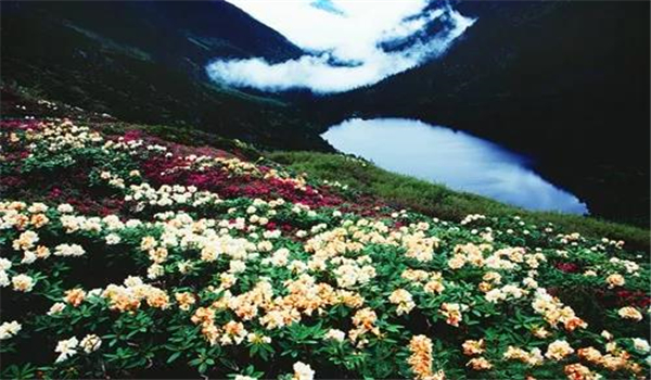 春夏之交,氣溫逐漸升高,雪山上冰消雪融,雪退到哪里,花就開到哪里,從山上到湖邊,到處是一片花的海洋,清碧透亮的湖水,映照著無邊的原始森林和空闊的藍(lán)天,最具特色的是高山杜鵑,它們盤根錯(cuò)節(jié)地葡伏生長,密密麻麻,殘雪還掛在枝葉間就把鮮花怒放,遠(yuǎn)遠(yuǎn)看去就象燃燒的火焰在狂風(fēng)中飄搖。