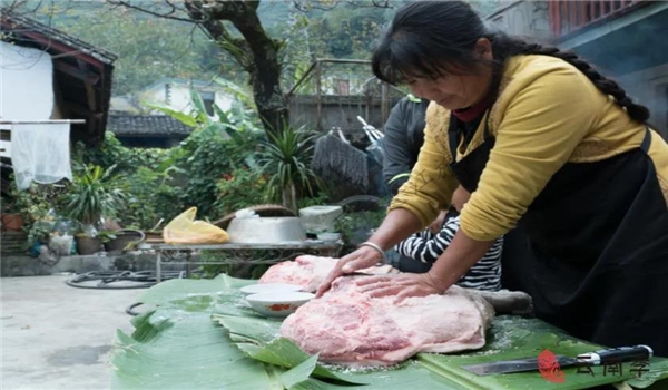 養(yǎng)殖足月的土豬,由農(nóng)戶自給性的腌制,先是用磨盤輕輕擠壓剛宰下的豬腿,將肉中的血水?dāng)D出,再按照一定比例抹上怒江特有的“桃花鹽”,反復(fù)翻壓十五到三十天后,放于陰涼處晾。期間需要對(duì)其進(jìn)行反復(fù)搓揉按壓,這樣既不破壞豬肉纖維 ,又能讓鹽分均勻滲入。