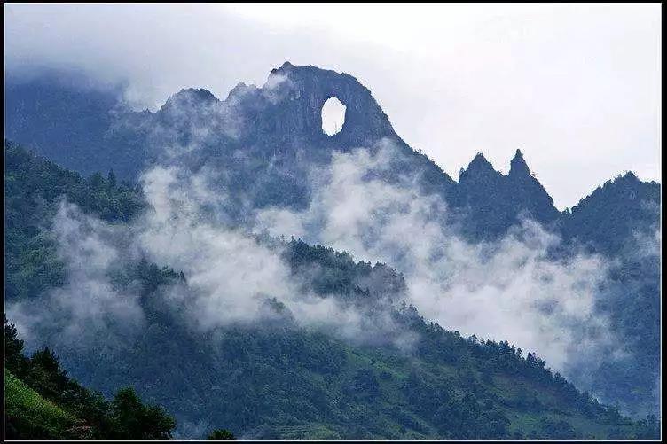 從遠(yuǎn)處眺望,透過石洞遙望山那邊明亮的天空,恰似一輪明月高懸于峰海山林之中,與天地融為一體,晝夜不落,有時日“月”同行,有時雙月媲美,其鬼斧神工,美倫美奐,令人嘆為觀止。