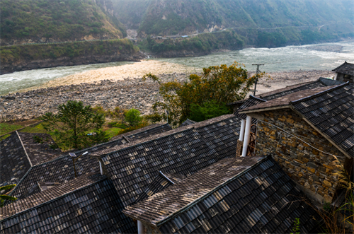 我們順著怒江由南往北,來(lái)到江水西岸的洛本卓白族鄉(xiāng),鄉(xiāng)政府再往北4公里,有一片錯(cuò)落的石頭房子,蓋在高黎貢山腳下的壩子里,山上一股泉水流進(jìn)怒江,這里便是托拖新村。