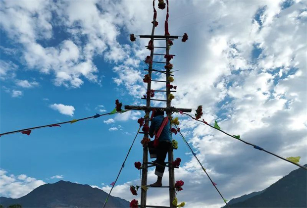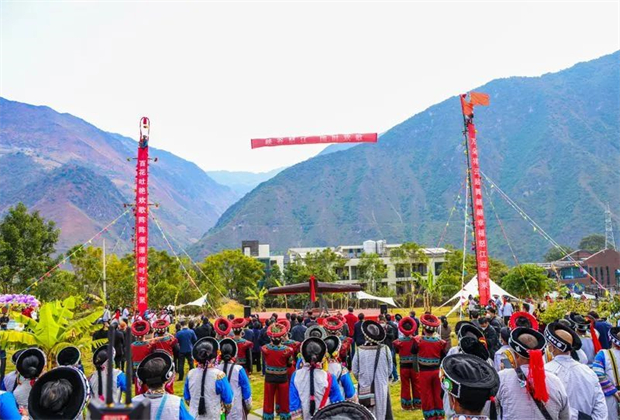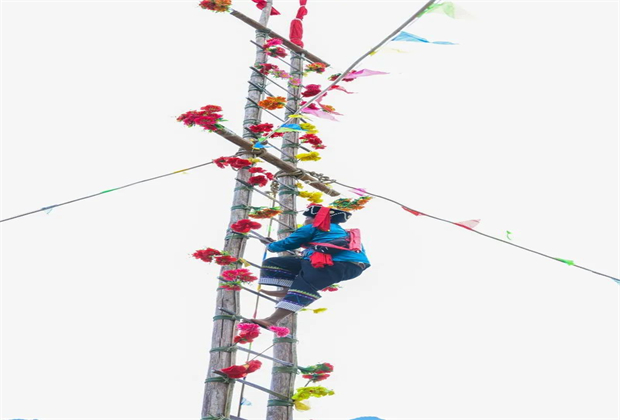 活動在傈僳民歌“擺時”展示《歌唱幸福好時光》中拉開序幕。嘉賓們參加了“吉祥神弩”啟弩儀式,見證傈僳人民歡度闊時節(jié)?;顒蝇F(xiàn)場,“刀桿祈?!北硌輰ⅰ捌砀!眱x式推向高潮,通過上刀桿“祈福”活動,為傈僳族同胞迎新祈福。