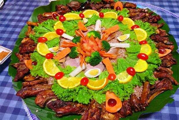 手抓飯大多出現(xiàn)在接待客人或節(jié)日中,和大家熟知的傣族手抓飯不同,傈僳族手抓飯會在一個洗滌干凈的簸箕內(nèi)放切成小塊的烤乳豬、土雞、琵琶肉,蕎米雞肉拌飯和涼拌木耳、清煮南瓜、土豆及特色佐料等。