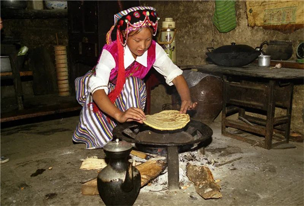 走進怒族群眾的家里,怒族群眾會用石板當鍋,把甜蕎粉、紅糖、清水和成的蕎面糊舀在鍋內(nèi),攤平在火塘三角架上的石板上,不用放油和其它佐料,烙熟即成。