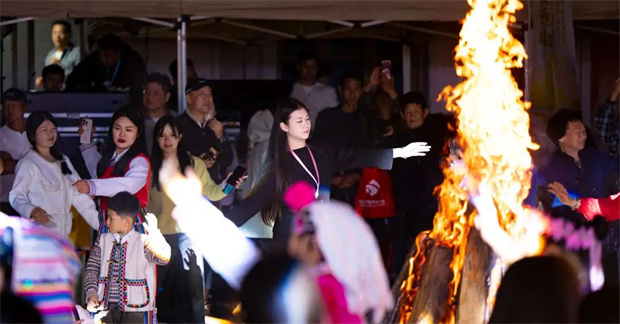 到了晚間,熊熊篝火燃起,來自四方的游客與當(dāng)?shù)馗髯迦罕娨黄饑@篝火載歌載舞。我拿著相機(jī)躊躇,不知道如何加入